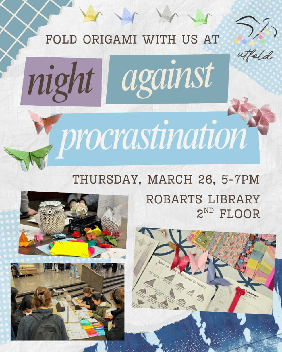 ✨ Fold Origami With Us at NAP (Night Against Procrastination)! ✨ We’ll be at NAP (Night Against Procrastination) hosting a relaxing origami session — come by, take a break, and get creative with us! 🧠💭 📅 When: Thursday, March 26⏰ Time: 5:00–7:00 PM📍 Where: Robarts Library, 2nd Floor ✨ What are we folding?Spring-themed origami like… Continue reading NAP (Night Against Procrastination) Workshop