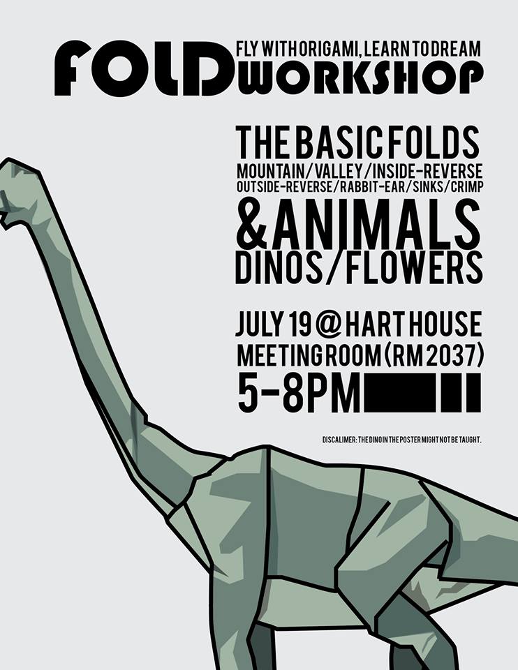 1. Another FOLD workshop for the summer. It will be on July 19th 5pm to 8pm in the meeting room 2037. It is right above the HUB. I will be covering the basic folds (mountain, valley, inside-reverse, outside-reverse, rabbit-ear, sinks, crimps) during the first half and folding animals, flowers, and DINOSAURS. Feel free to request any designs you would like (ut.fold@gmail.com).