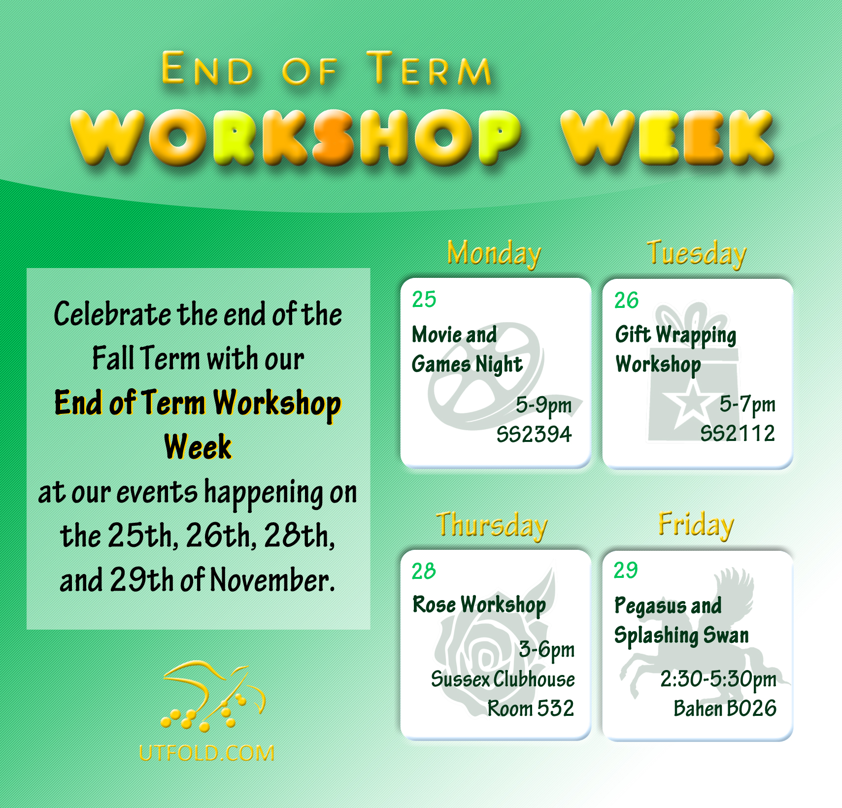 Lucy Yeung, our VP Internal, will be teaching a workshop on gift wrapping on Tuesday November 26th from 5p.m – 7p.m at SS2112. This is a great chance to learn the perfect gift wrapping skills right before the holiday season to impress those who you care. For all you interested members, see you there!