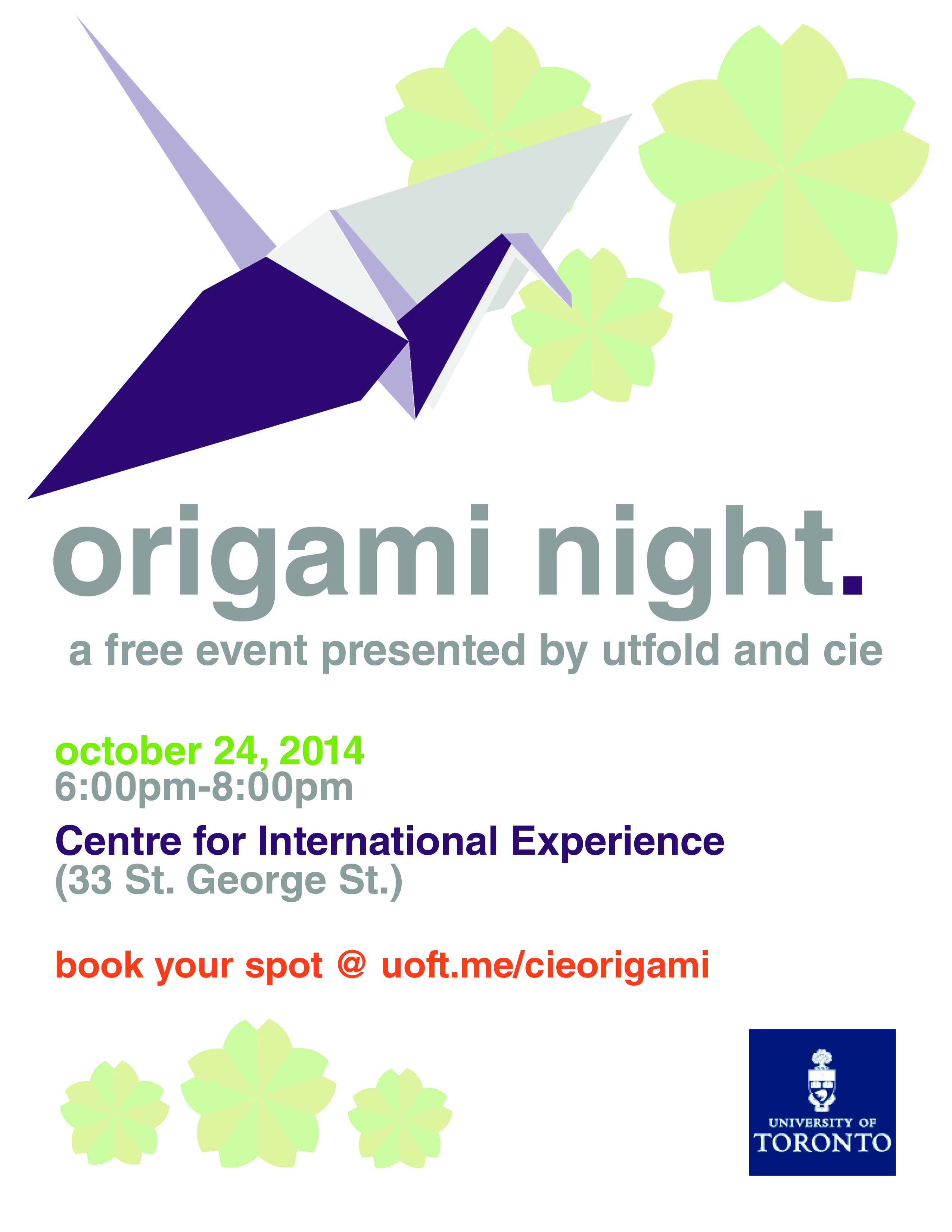 We are co-hosting an Origami Night this Friday with the Centre for International Experience at the Cumberland House! This will be a great chance to meet with international students who have chosen to come to UofT and get to know them over a fun workshop. We hope to see you there!