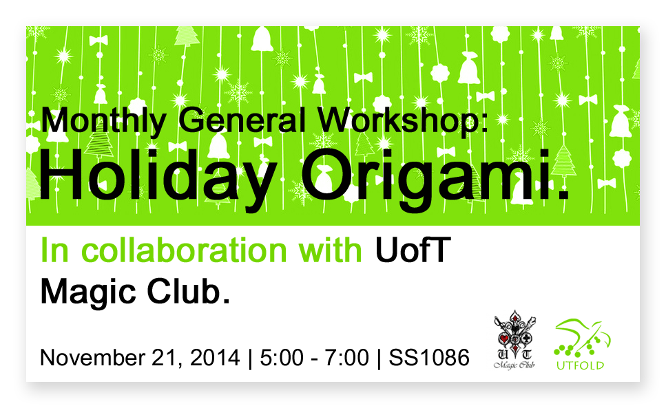 We will be having our Monthly General Workshop for November this coming Friday! This will a very special workshop in that we are collaborating with the UofT Magic Club. We will be folding a variety of holiday themed models such as a Christmas trees, Santa Clause, and much more! Hope to see you there!