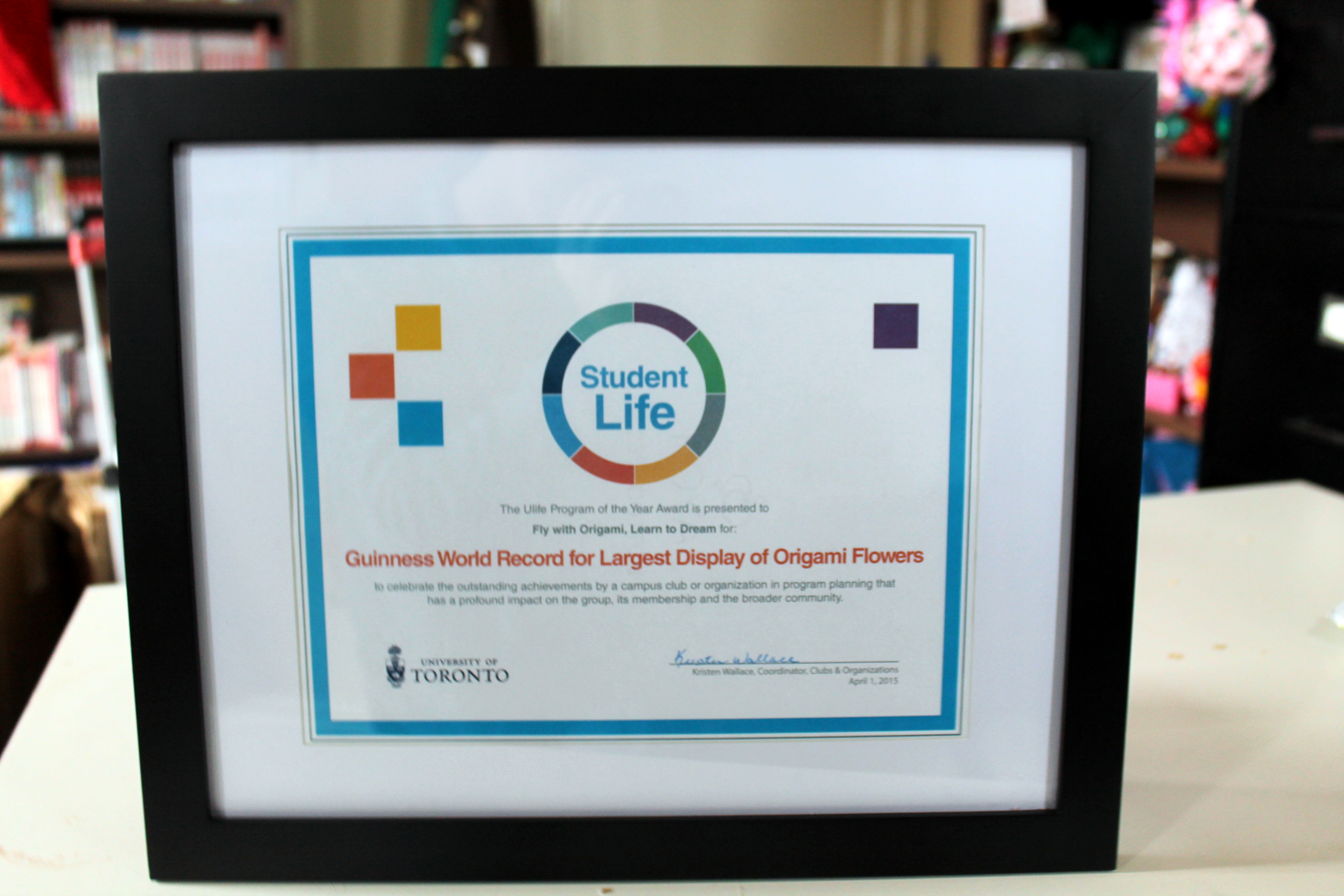 It is with my honour to announce that UTFOLD has won Program of the Year Award for our project, “Guinness World Record for Largest Display of Origami Flowers” at the Office of Student Life Year End Celebration on April 1st, 2015. Congratulations to all the members who were apart of the project, our Guinness World Records Team, the previous executive team and the Outgoing and Guinness Project President, Susan Cui for tirelessly committing themselves over the course of 10 months to the success of the project!