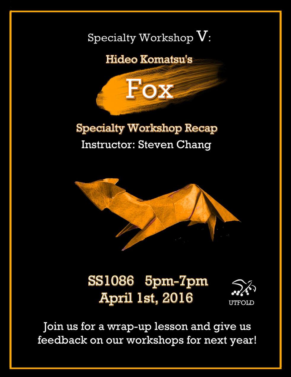 Join us this Friday for our final specialty workshop and final workshop of this school year! We will be folding a fox. Hope to see you there! Event: Specialty Workshop 5 – Fox Time: April 1, 2016 Time: 5:00 PM – 7:00 PM Location: SS1086