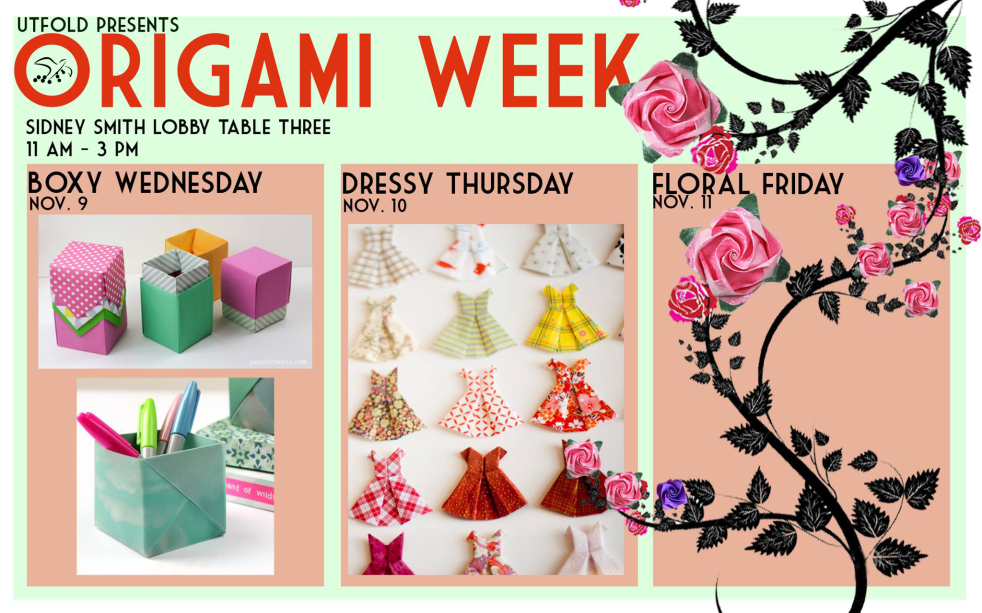 (Origami is the Japanese art of paper-folding.) Celebrate Origami Week with UTFOLD by learning how to fold a variety of models from boxes, to fancy dresses, to flowers. Drop by on Nov 9-11 11am – 3pm SS Lobby Table 3! Participation is completely free. All materials will be provided by UTFOLD. All skill levels… Continue reading Origami Week