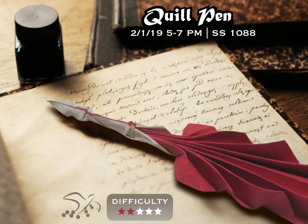 On Friday, during our normal workshop hours, we’ll be exploring methyl cellulose’s second key function in origami: wet-folding! Anna and Jingxiu will teach everyone how to fold the Quill Pen (a beginner-friendly model). We’ll provide Chiyogami paper and methyl cellulose solution. Since the model may not take the full two hours to fold, feel… Continue reading Quill Pen Workshop