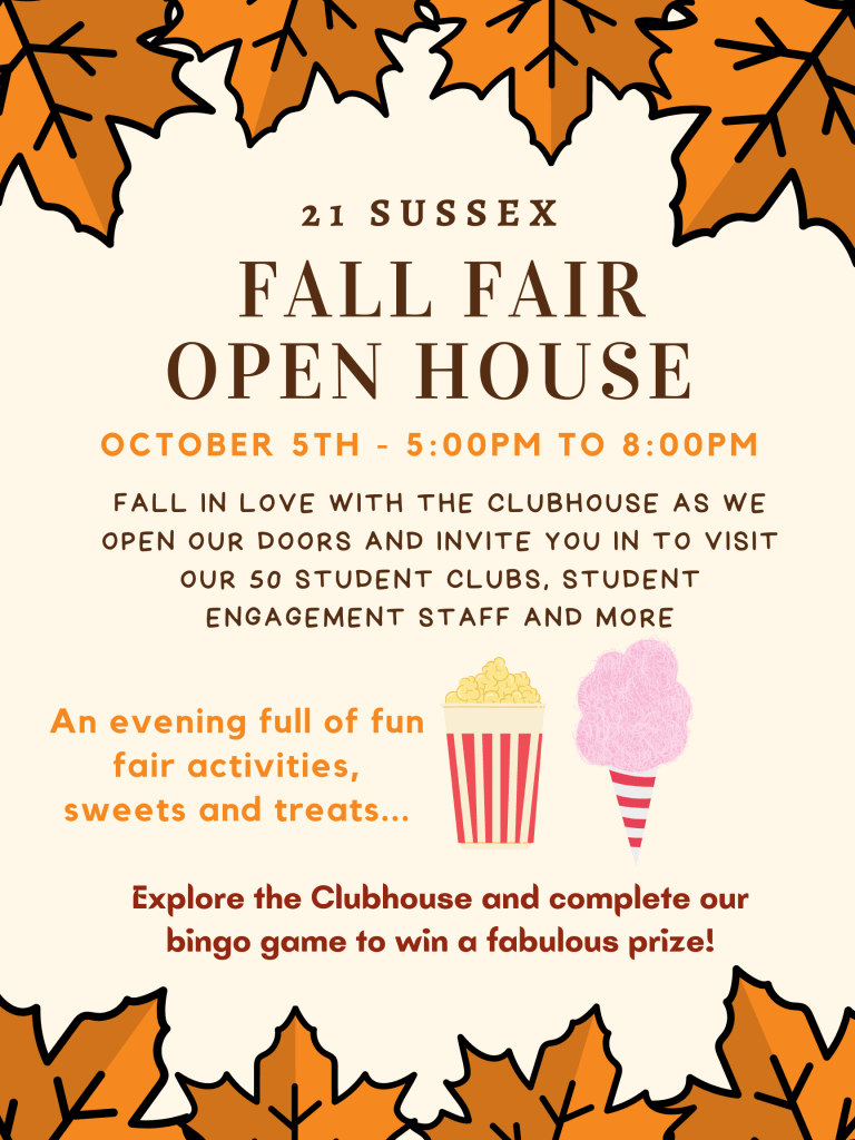 - (Student-Life organized event), get to know the 50+ clubs and 15+ staff housed in the 21 Sussex Clubhouse!