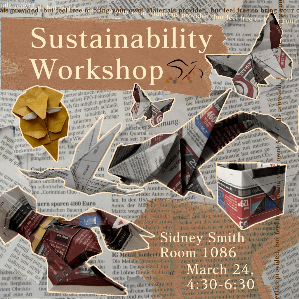 Wanna come to the sustainability workshop? This week, we emptied our mailboxes to bring to you flyers and paper spam mail galore to be transformed into awesome, amazing, astonishing creations (like Larry the Lobster). Don’t see what all the fuss is about? Fine, then just join us πFriday, March 24, β 4:30-6:30 PM at πSS1086. At the very least, by the end of the session, you’ll know how to make a simple and nifty box.