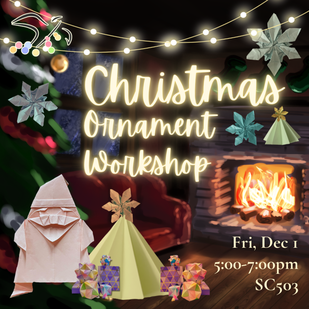 As the end of classes is near and finals are quickly approaching, we are hosting our last regular workshop of this calendar year! As the holiday season is almost here, we are hosting a Christmas Ornament Workshop! π Come join us this week to fold some cute holiday-inspired origami that you can use to decorate your home and start feeling some of that holiday cheer! π