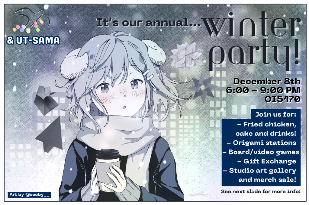 We’re so excited to announce our annual Winter Party collaboration with UTAMA! Enjoy a night of food, origami, and fun games with our club room neighbors :3