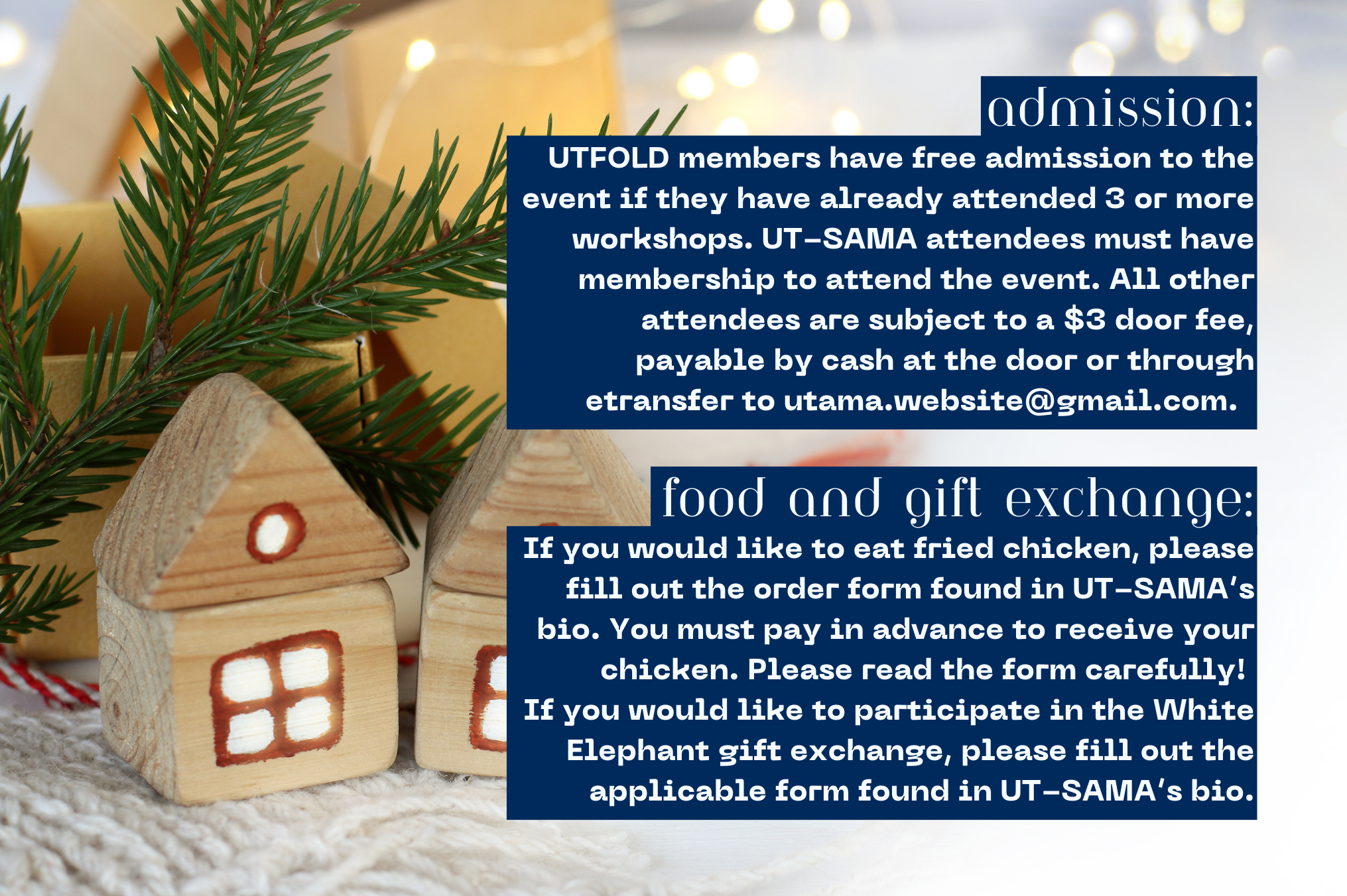 Come by to hangout with fellow UT-SAMA and UTFOLD members, eat fried chicken and christmas cake, make origami, play some board games or video games, exchange gifts, check out the UT-SAMA art studio’s merch and gallery, and so much more! ٩( ᐛ )و If you’d like to participate in the white elephant gift exchange, please sign up here asap: https://forms.gle/WmfX8yg64CrbCtwK9