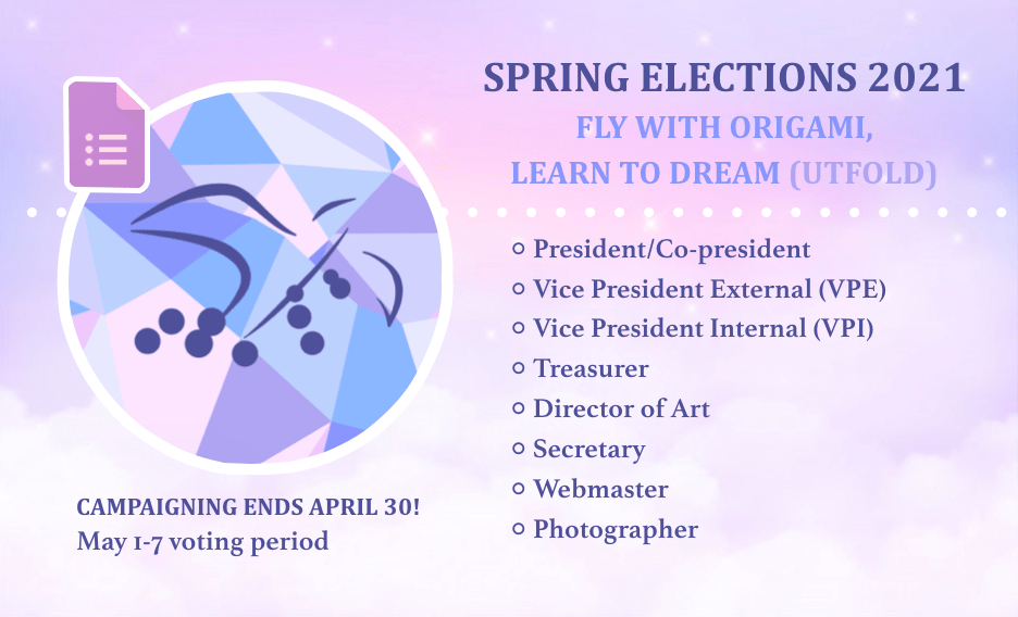 Hello, the origami club needs your help for a bright future! Current Execs are graduating or going on PEY, but the work we’ve done is well-documented in the Drive. With your excitement and UTFOLD’s 14-yr. foundation, new levels of epicness can be reached! U of T students can run for: President/Co-president, Vice President External, Vice… Continue reading Spring Elections